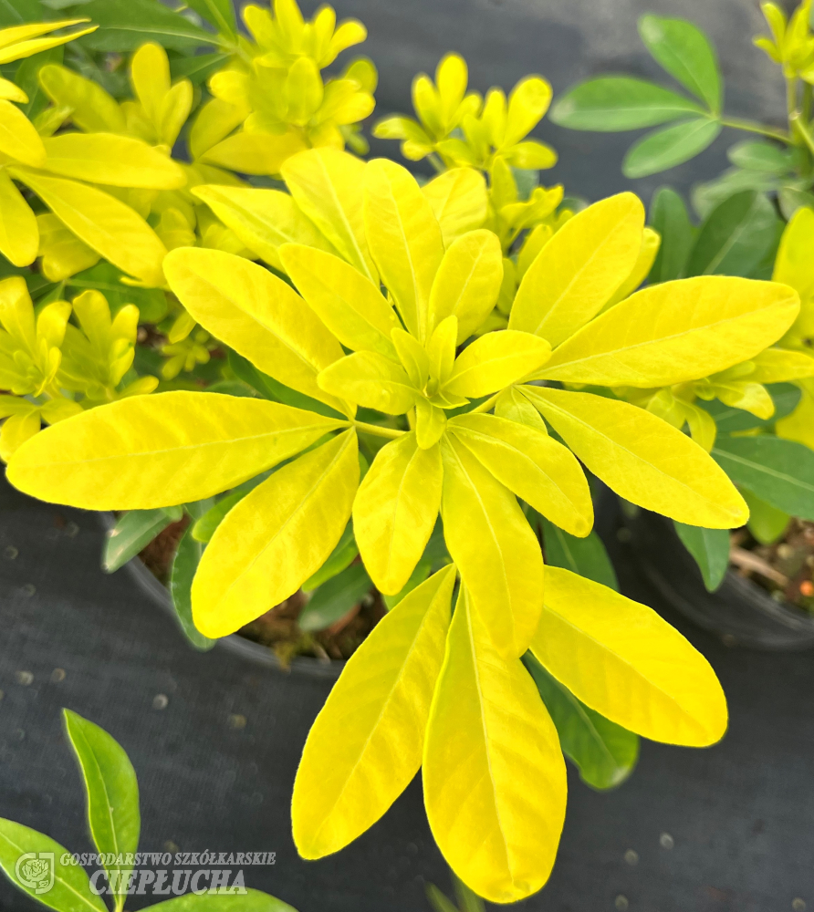 A low, compact evergreen shrub, reaching about 1 m in its natural habitat. This variety has yellow-green, strongly fragrant leaves, approximately 5 cm long. White, scented flowers appear in clusters and bloom abundantly in mid-May. The plant grows best in fertile, well-drained but moist soils, in a sunny and sheltered location. Not frost-hardy – requires careful protection during winter. Ideal for small gardens and exotic plant collections.