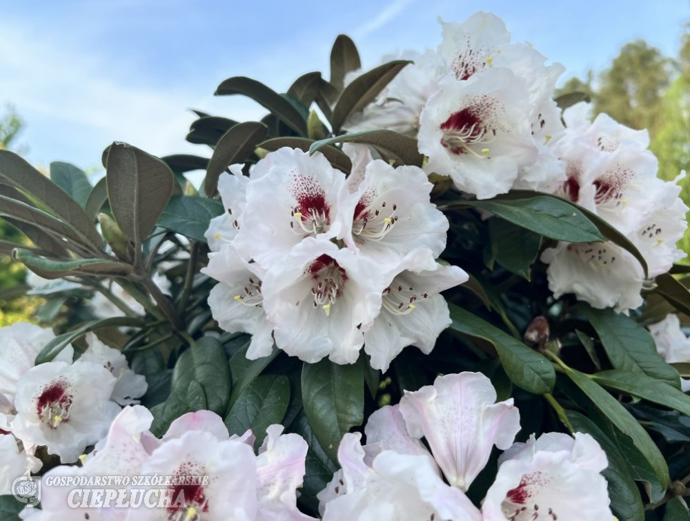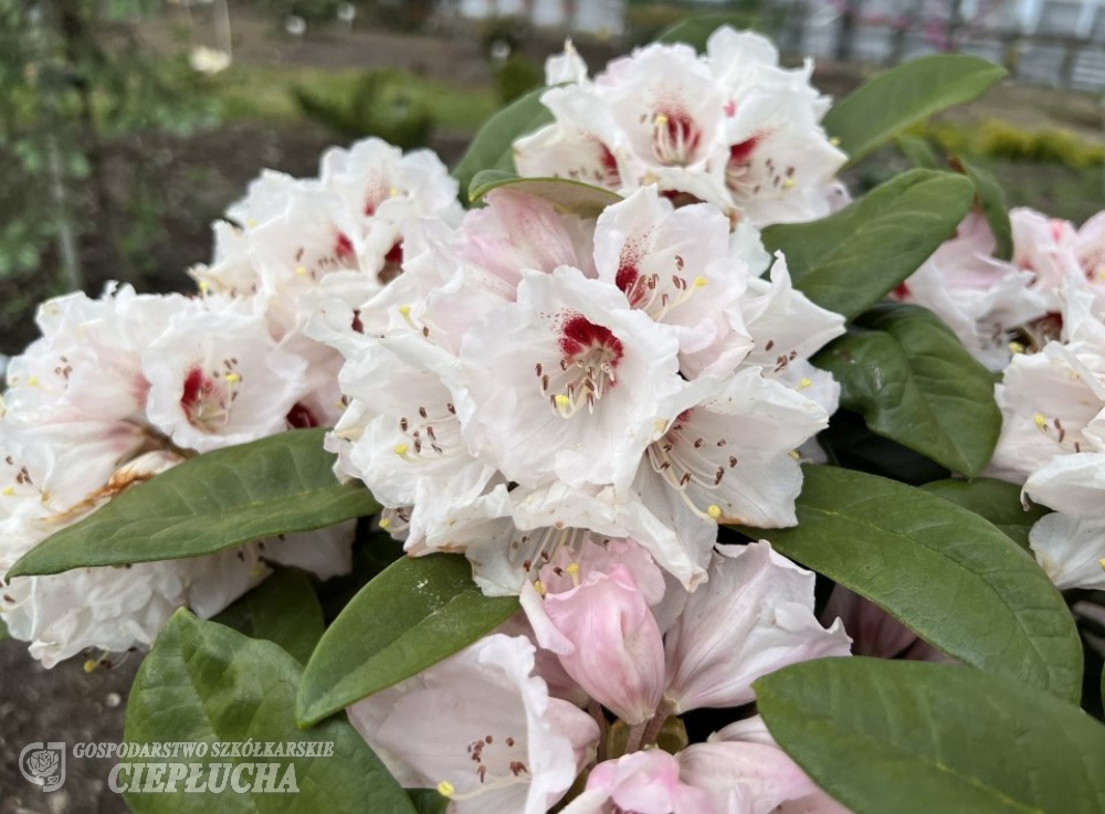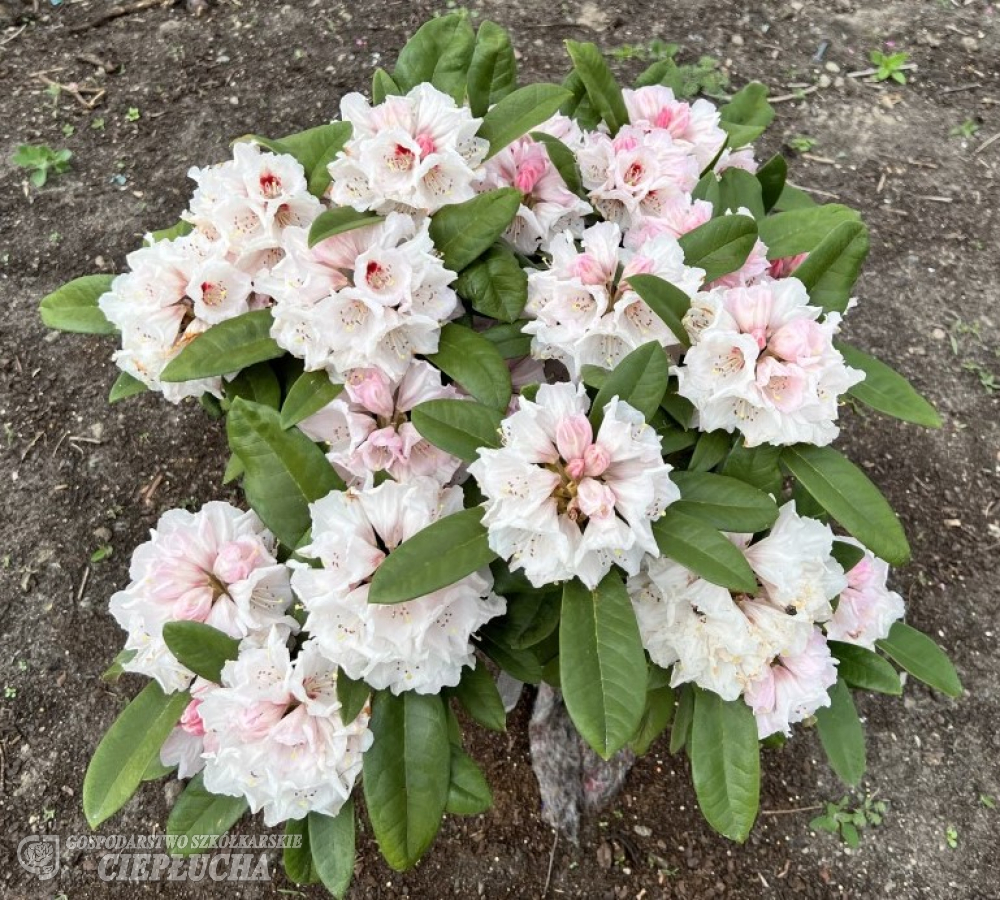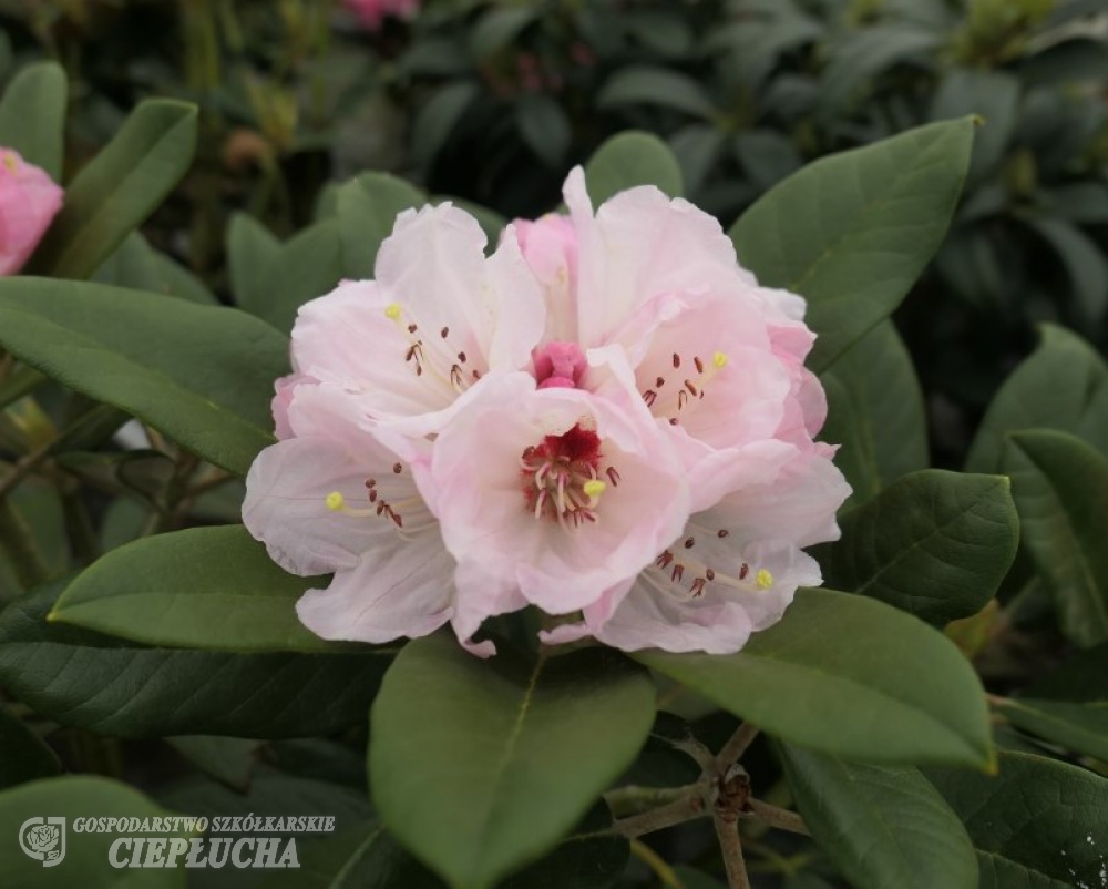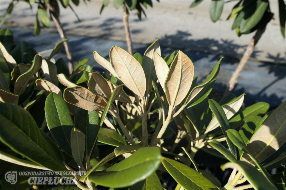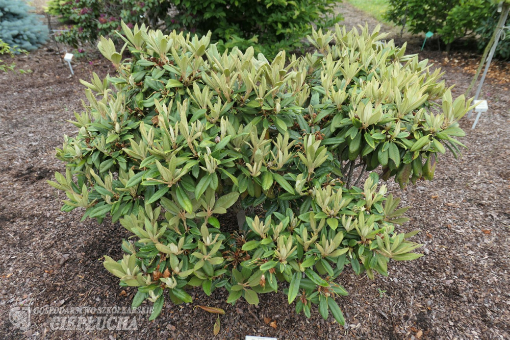 Rhododendron from Yakushimanum group with attractive foliage – young shoots covered with a cream tomentum. With suede like, light cream indumentum. Leaves are rather large, oval, flowers light pink, slightly frayed, fading during blooming period. Dense, erected habit. Growth is typical for Yakushimanum group – in 10 years reaches 80-100 cm. Frost resistance of -24°C.