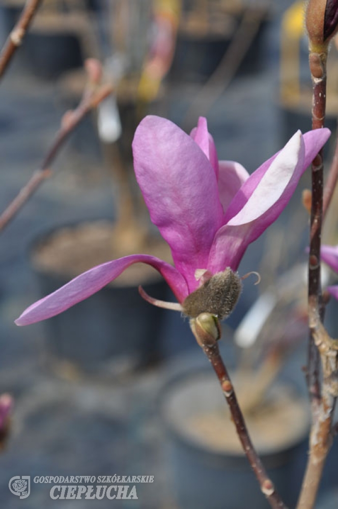 Okazały krzew lub małe drzewko o wyprostowanym pokroju, osiągające ok. 3,5 m wysokości po 15 latach. Kwitnie bardzo obficie na początku maja, przed rozwojem liści, dużymi kwiatami fioletowoczerwonymi z zewnątrz i białymi wewnątrz, odpornymi na wiosenne przymrozki. Preferuje stanowiska słoneczne lub lekko cieniste, osłonięte, oraz gleby żyzne, wilgotne, przepuszczalne i lekko kwaśne. Wymaga ściółkowania, ochrony korzeni zimą, unikania przesuszenia i cięcia; idealna do małych ogrodów.