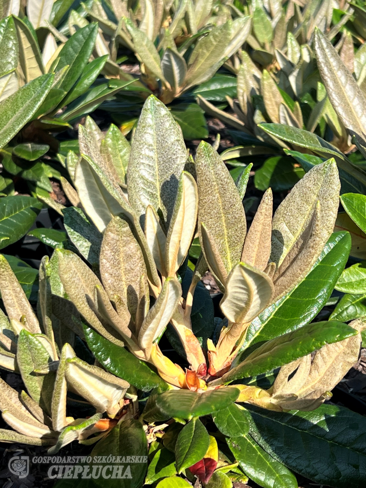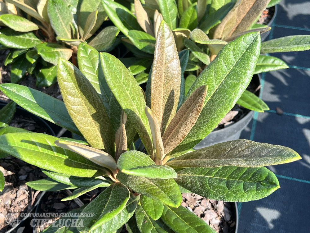 Wyjątkowa krzyżówka różanecznika o ciemnobrązowych przyrostach pokrytych kremowym kutnerem (nalotem). Starsze liście ciemnozielone, błyszczące, bardzo atrakcyjne i duże. Wzrost średnio-silny - dorasta do ok. 1,5m po 10 latach uprawy. Kwitnie w kolorze kremowym. Wymaga okrywania na zimę. Mrozoodporność do około –18 °C.
