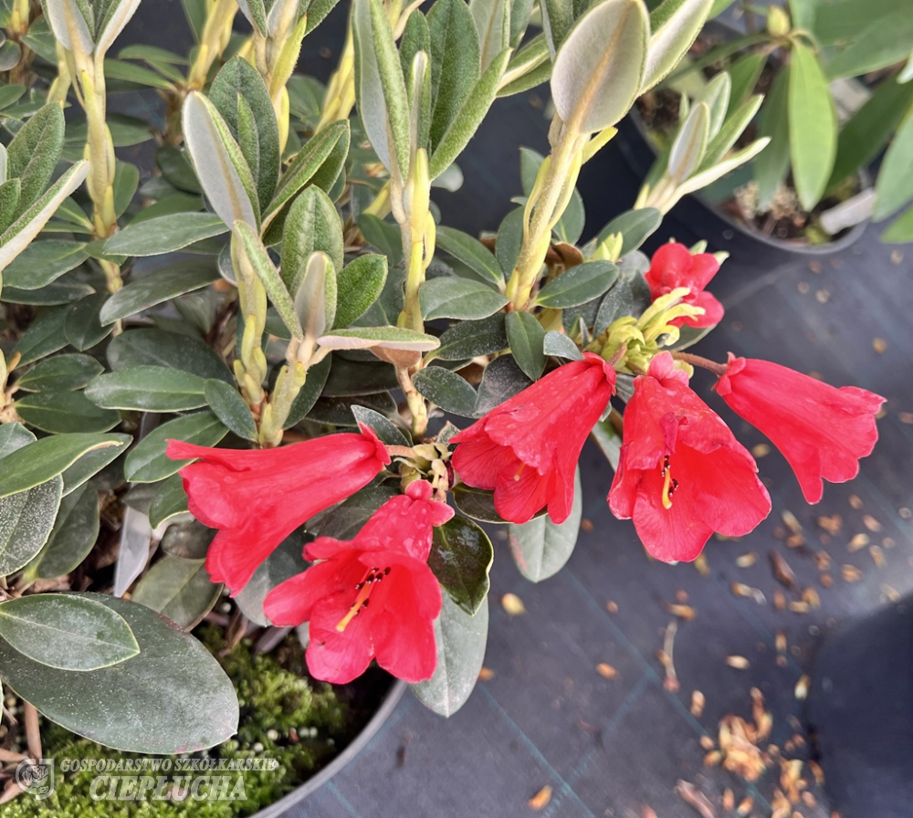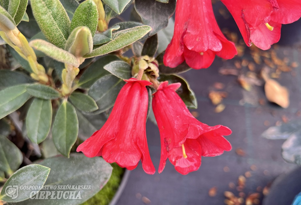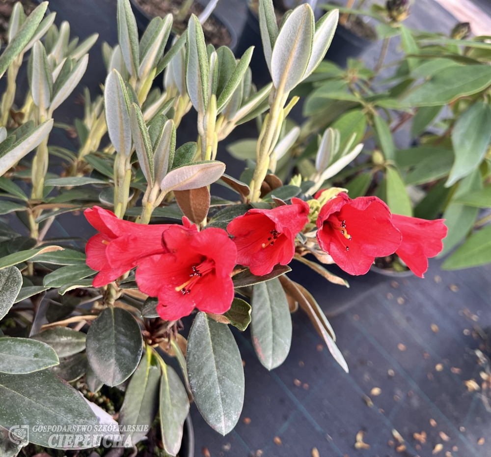 Gatunek różanecznika o intensywnie czerwonych, lejkowatych kwiatach z ciemniejszymi plamkami. Liście ciemnozielone, błyszczące, owalne. Roślina rośnie dość powoli, osiągając około 1,2m wysokości w ciągu 10 lat. Najlepiej czuje się w półcieniu, w miejscach osłoniętych od mroźnych wiatrów. Mrozoodporność do około –18 °C.